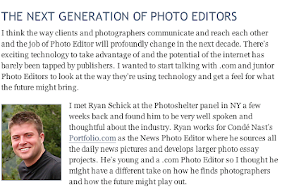 Ryan Schick works for Condé Nast’s Portfolio.com as the News Photo Editor where he sources all the daily news pictures and develops larger photo essay projects. In an interview by Rob Haggert he mentioned that my blog is one that he reads often. Click on the link above to read the article.