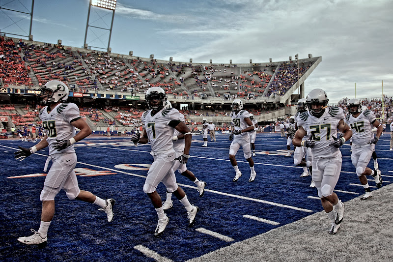 Here's a snap from Boise State before the game. It's shocking how much different the attitude toward the Ducks changed so dramatically from before the game to after the game. This photo looks a little different because it was highly processed in Color Efx Pro and Aperture. I a few hours, I'm taking off for Eugene to shoot the Oregon vs. Purdue. We'll see how that goes.